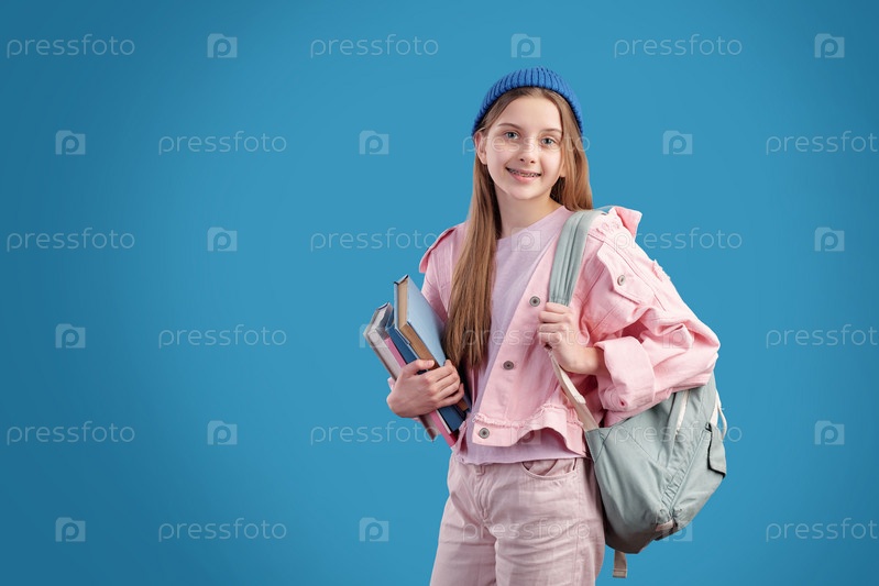 Счастливая и успешная студентка-подросток в повседневной одежде, несущая рюкзак и книги