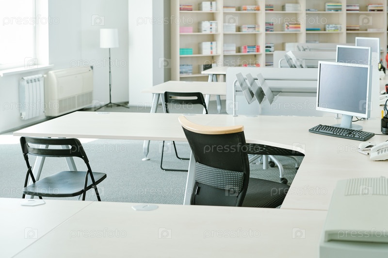 Ряд столов с компьютерными мониторами и стульями рядом на фоне полок