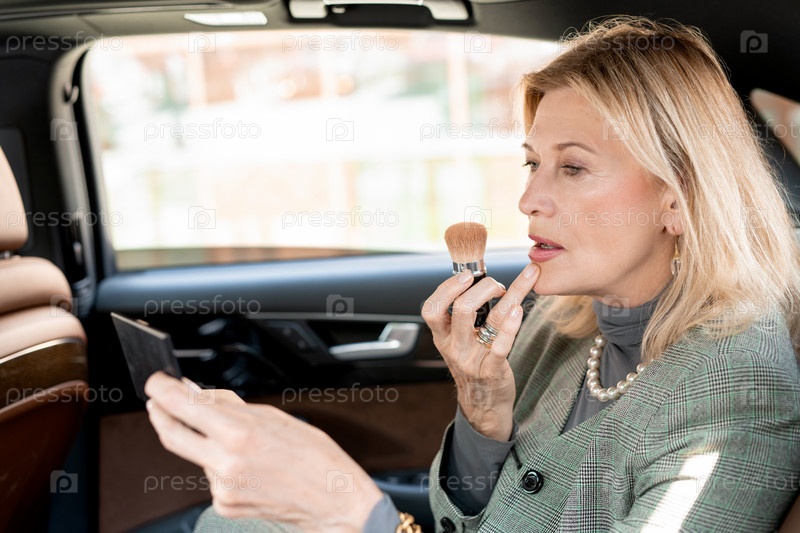 Зрелая блондинка-бизнесменка наносит краску или порошок на лицо в такси