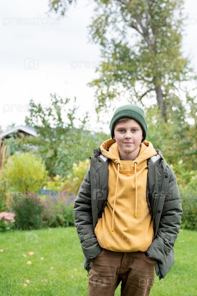 Красивый и очаровательный школьник в шапке, капюшоне, штанах и теплом куртке