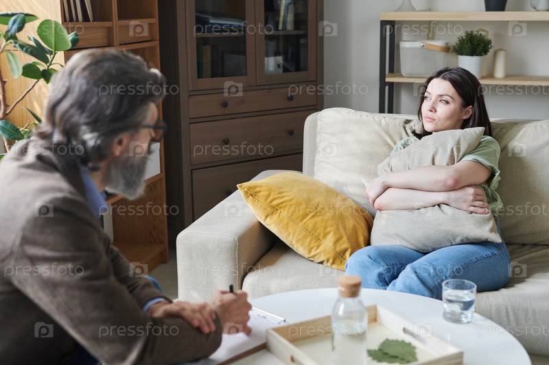 Молодая расстроенная женщина с подушкой рассказала консультанту о том, что произошло