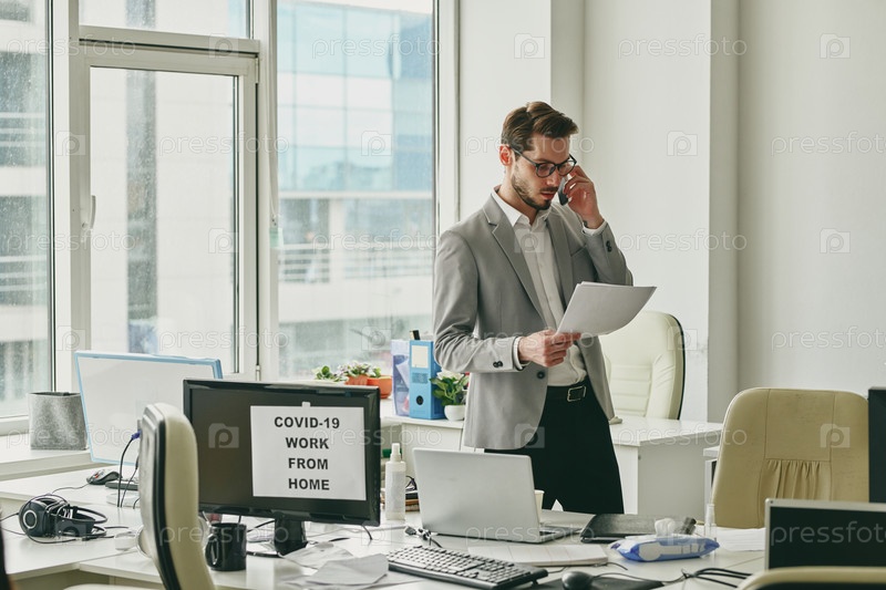 Современный молодой бизнесмен в формальной одежде консультирует клиента по телефону