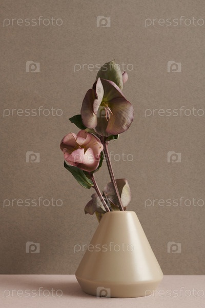 Современная минималистическая натюрмортовая композиция с красивой ветвью цветка в вазе на фоне теплого камня серого стенового фона, копирование пространства