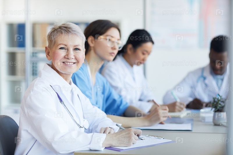 Зрелая женщина-врач, улыбающаяся на встрече