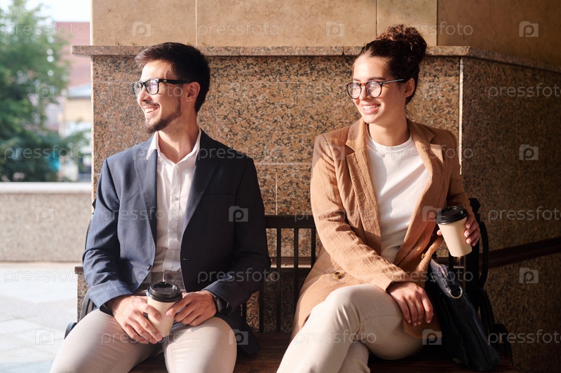 Молодые уверенные брокеры в умной повседневной одежде пьют кофе в городской среде
