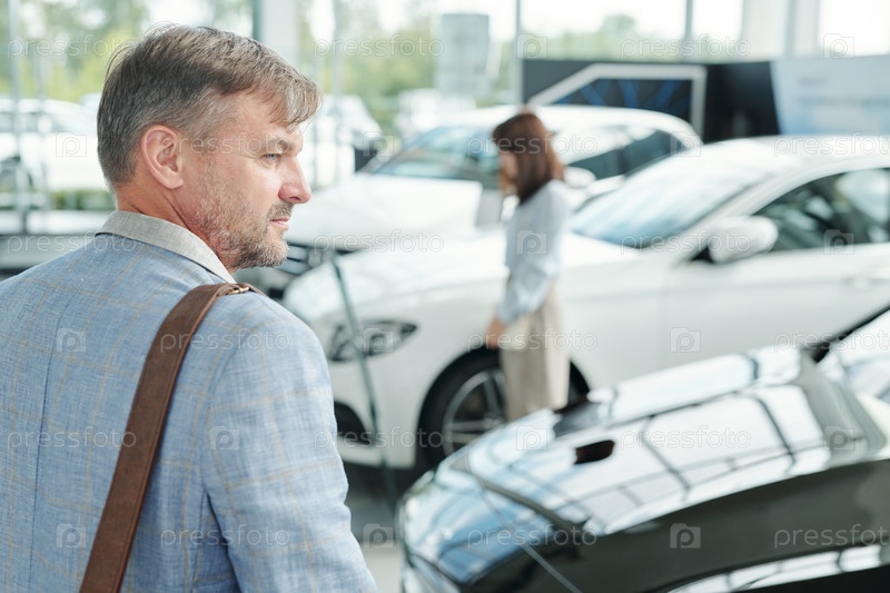 Задний вид серьезного современного зрелого мужчины, стоящего рядом с роскошной черной машиной