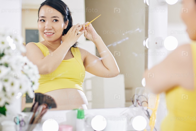 Беременная женщина прикасается к волосам