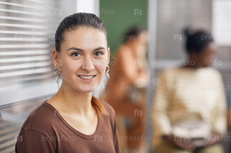 Улыбающаяся женщина ждет в офисе