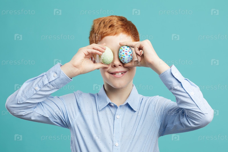 Мальчик позирует с пасхальными яйцами