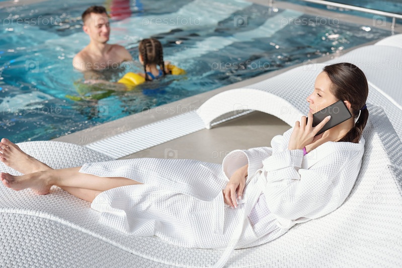 Молодая занятая женщина в халате сидит на кресле и разговаривает со своим смартфоном