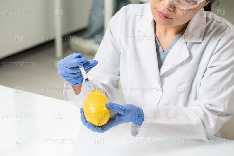 Перчаточные руки современной молодой ученой-женщины в белом халате, инъекционирующей лимон