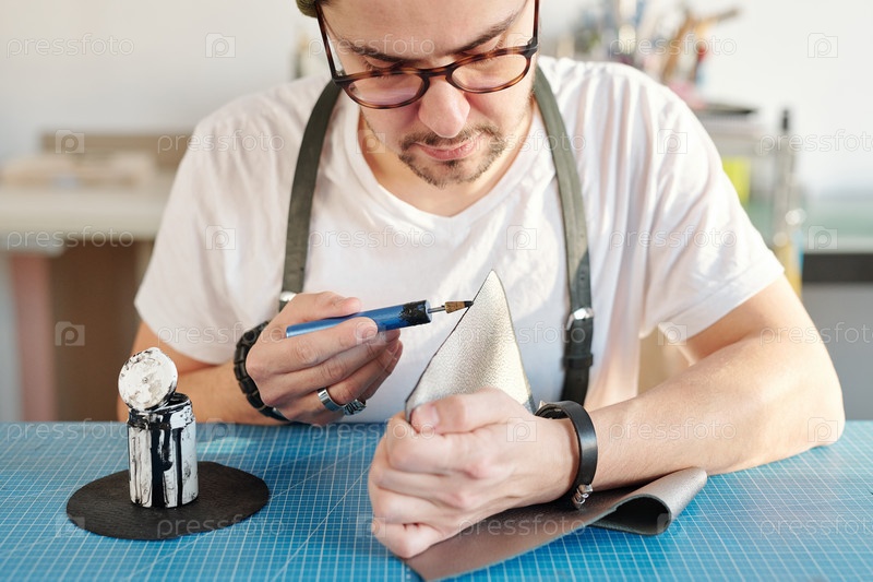 Молодой креативный кожевенник наносит черную краску на край кожаного изделия