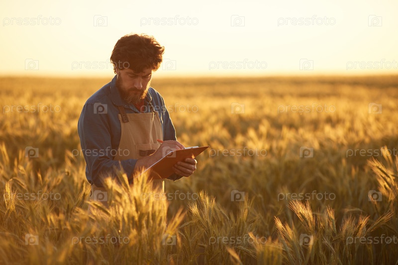Зрелый фермер на полях при закате солнца
