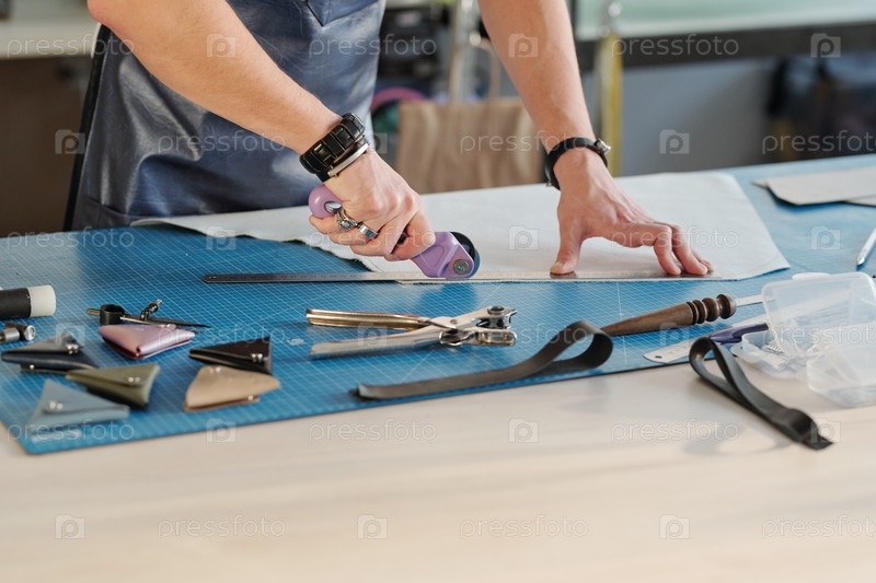 Руки молодого кожевенника, использующего резчик в то время как он держит линейку на куске шерсти