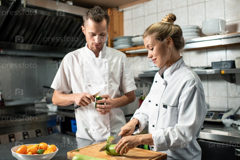 Молодой мужской шеф-повар с ножом очищает авокадо и консультирует свою женскую стажерку