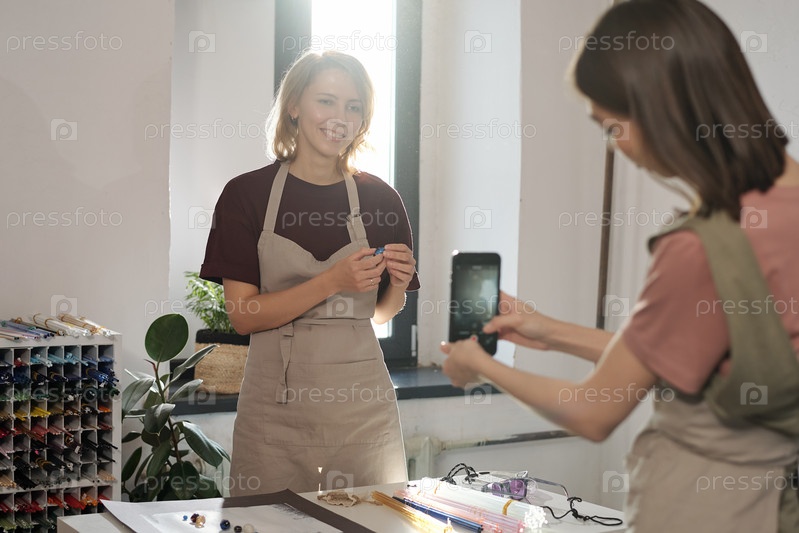 Счастливая молодая блондинка с ручным стеклянным бусином, стоящая на рабочем месте