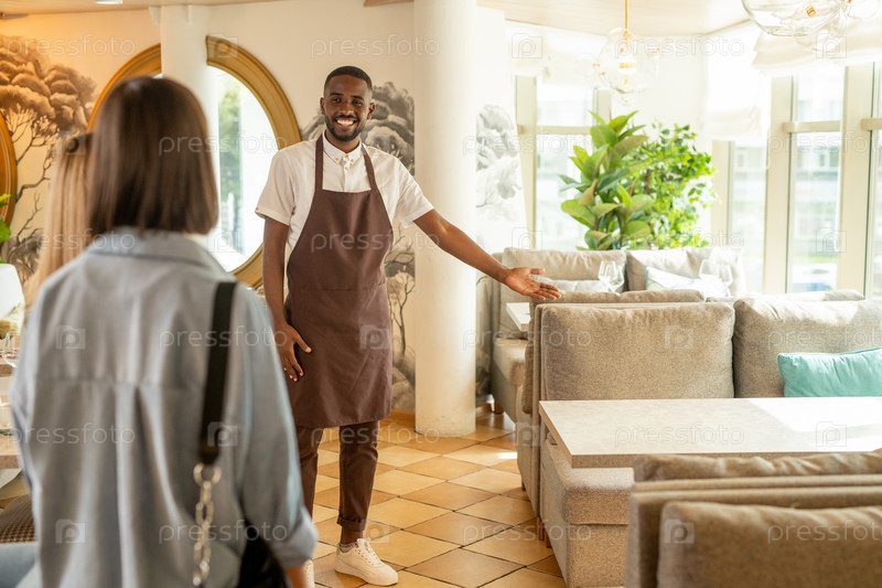 Молодой веселый официант в рабочей одежде приглашает гостя-женщину занять место за столом