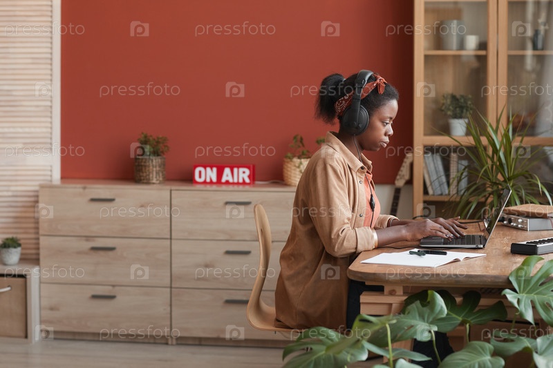Афроамериканская женщина-музыкант редактирует музыку с помощью ноутбука