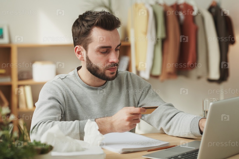 Серьезный молодой бизнесмен собирается заказать лекарства в интернет-аптеке