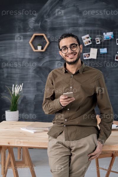 Счастливый успешный предприниматель-мужчина собирается позвонить кому-то в офисе