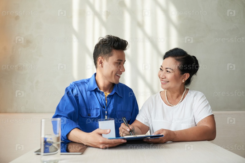 Женщина подписывает контракт с уборщиком