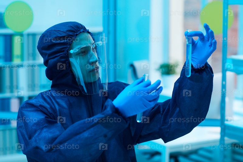 Медицинский работник, носящий опасный костюм в лаборатории