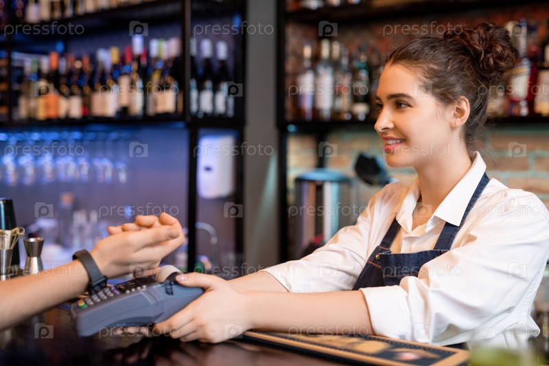 Счастливая молодая официантка держит платежный автомат за стойкой