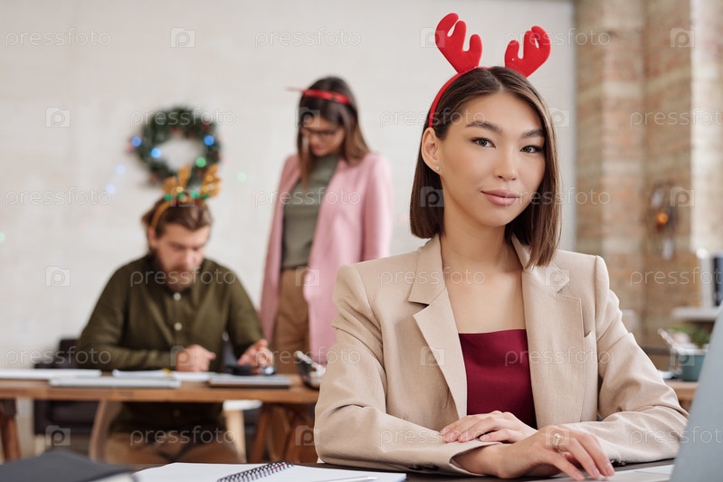 Молодая брюнетка-менеджер в сети умных повседневных и рождественских головных уборов