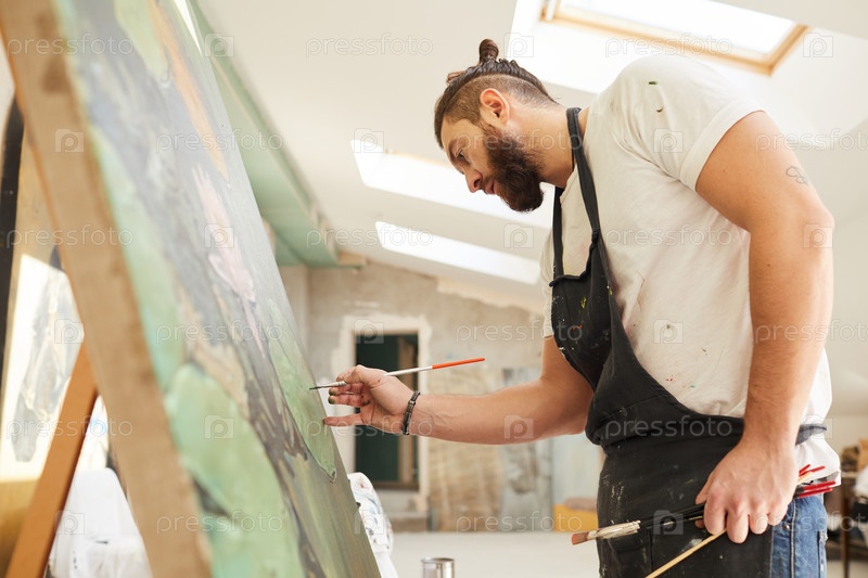 Бородатый художник рисует на лодке в художественной студии