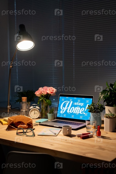 Лампа над деревянным столом с цветами, ноутбуком и другими принадлежностями в темной комнате