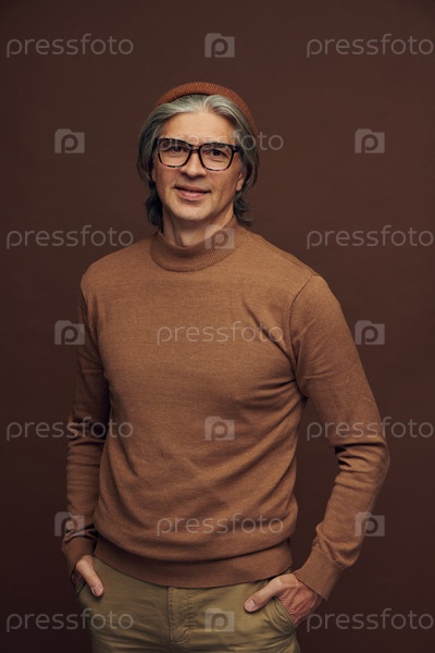 Портрет контента уверенный хипстер мужской дизайнер в коричневом наряде, держащий руки в карманах на изолированном фоне