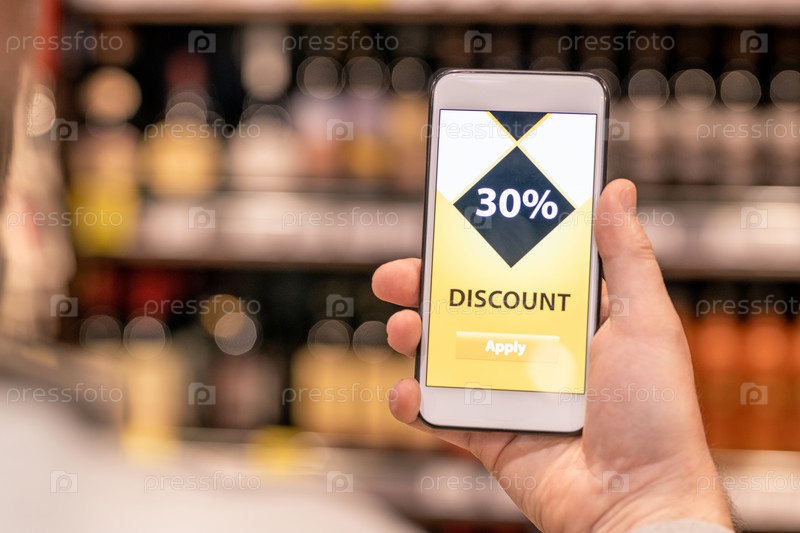 Рука современного пожилого мужского клиента со смартфоном, использующего скидку