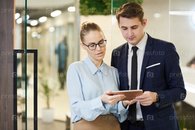 Деловая пара, использующая планшетный компьютер