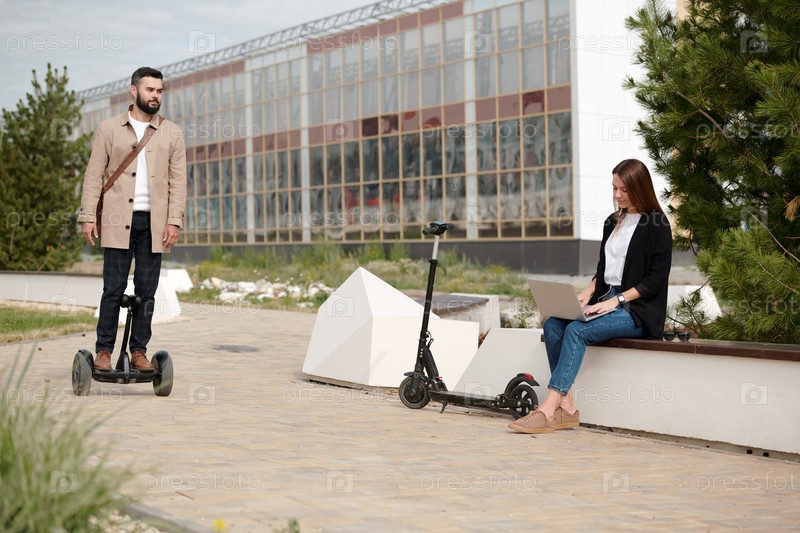 Элегантный бизнесмен, стоящий на гироскопе во время передвижения со стороны коллеги по работе в сети