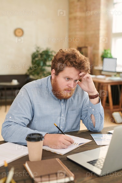 Удивленный стройный молодой человек с красной бородой сидит за столом и опирается головой на руку, глядя на экран ноутбука и делая записи в дневнике