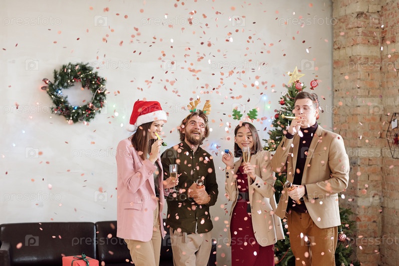 Молодые коллеги, стоящие в конфетти, падают во время стрельбы по крекерам на вечеринке