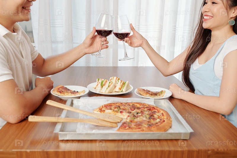 Пара пьет вино и пиццу