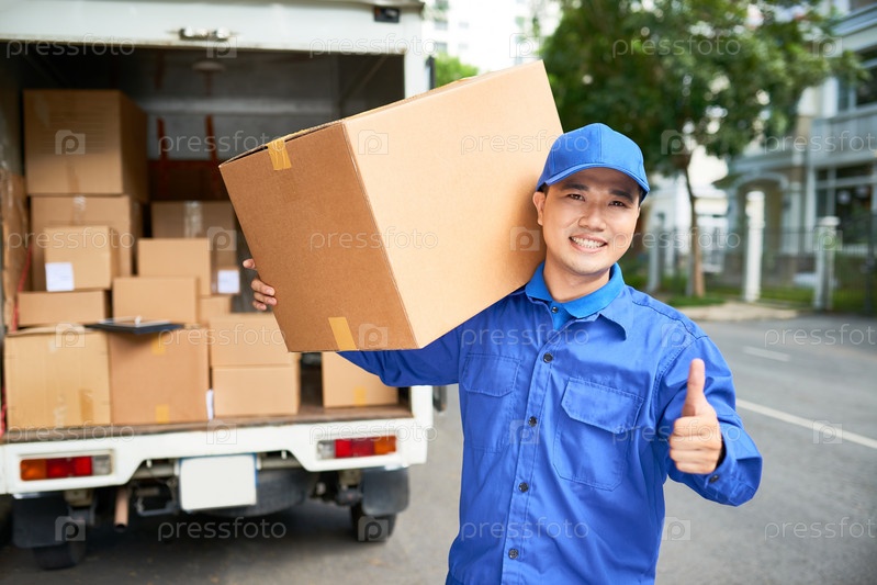 Веселый доставщик с коробкой