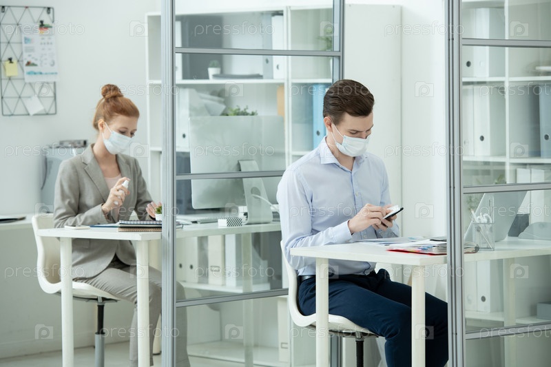 Молодой бизнесмен в защитной маске и формальной одежде использует смартфон