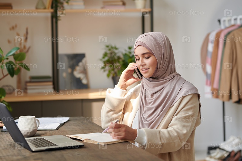 Красивая мусульманская бизнесвумен, одетая в хиджаб, сидит за столом и обсуждает рабочие вопросы по телефону и делает записи