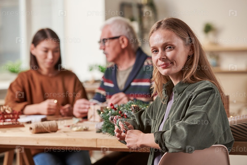 Портрет улыбающейся молодой женщины в рубашке, сидящей за столом с инструментами рождественского ремесла, она проводит Рождественскую ночь со своей семьей