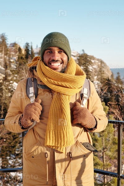 Молодой веселый африканский мужчина с рюкзаком, стоящий на деревьях и скалах