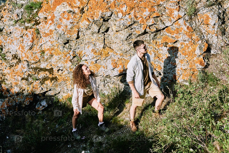 Счастливая молодая пара в повседневной одежде движется вверх по большой скале