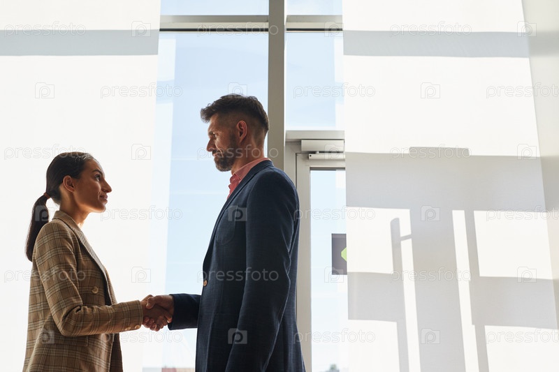 Бизнесмены, пожавшие руку современному окну