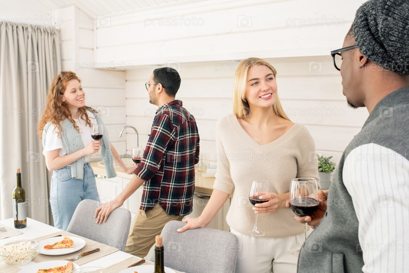 Случайная молодая блондинка со стаканом вина смотрит на африканского парня с улыбкой