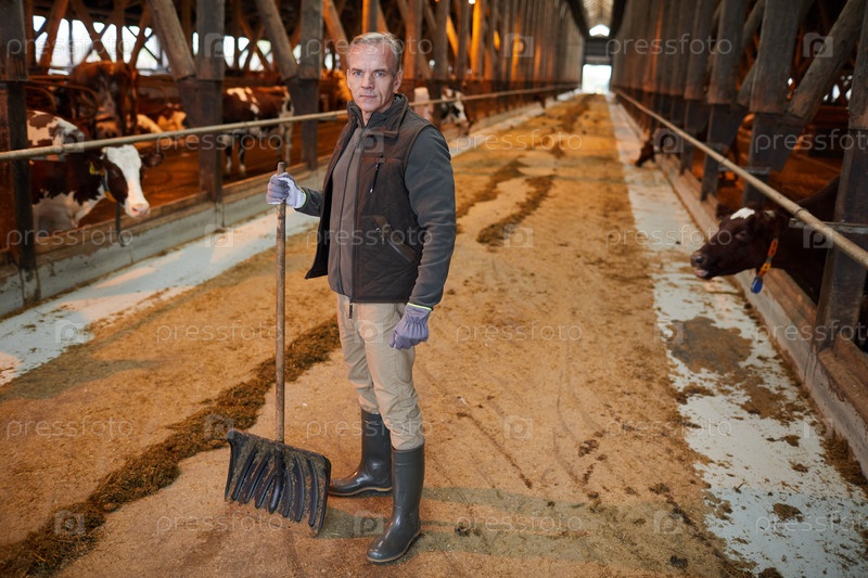 Зрелый мужчина убирает сарай для скота на ферме