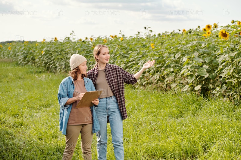 Два веселых фермера в рабочей одежде смотрят на поле подсолнечника перед камерой