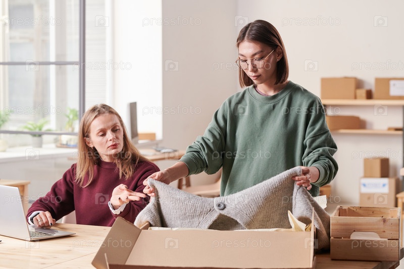 Девушка смешанной расы в очках держит теплый кардиган, пока ее коллеги проверяют его качество перед отправкой клиенту
