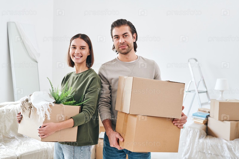 Молодая улыбающаяся женщина и ее муж с упакованными коробками смотрят на вас