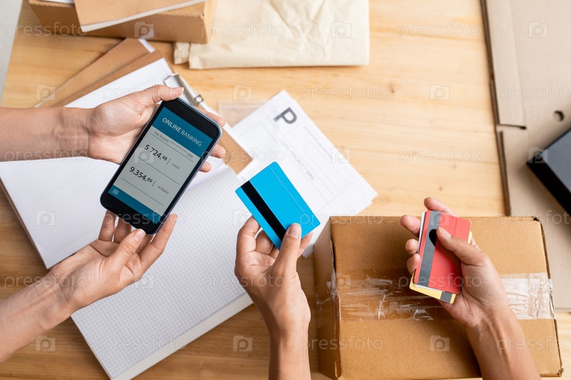 Обзор рук двух женщин-менеджеров, держащих смартфон и пластиковые карты